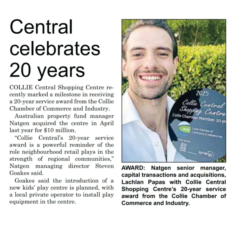 “Collie Central’s 20-year service aware is a powerful reminder of the role neighbourhood retail plays in the strength of regional communities,” Natgen managing director Steven Goakes said.