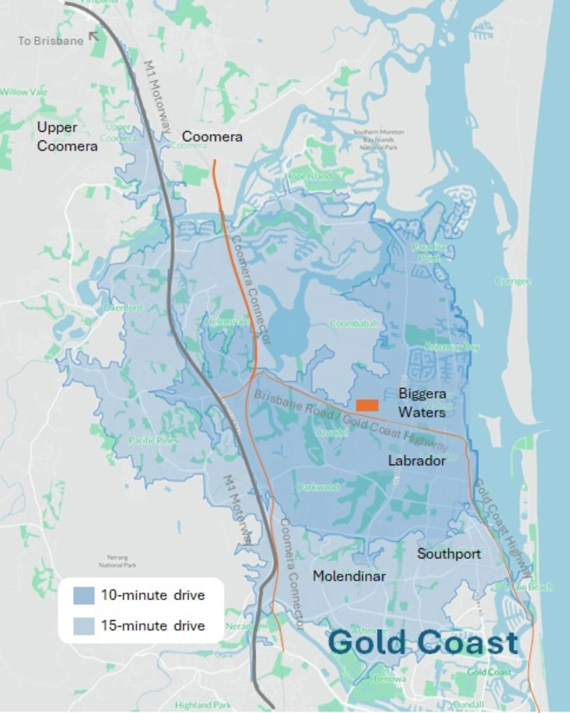 Biggera Waters is an established residential and commercial suburb at the northern end of the Gold Coast. The Property benefits from strong connectivity via the Brisbane Road / Gold Coast Highway corridor to the M1 Motorway Harbour Town Premium Outlets and the Coomera Connector.